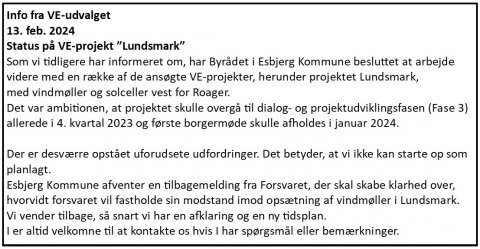 Vi blev orienteret om opkøbet af jorden i Lundsmark-området (Vestermarksvej), samt at der nu bliver lavet et fælles projekt mellem opstillerne fra hhv. European Energy samt Better Energy.